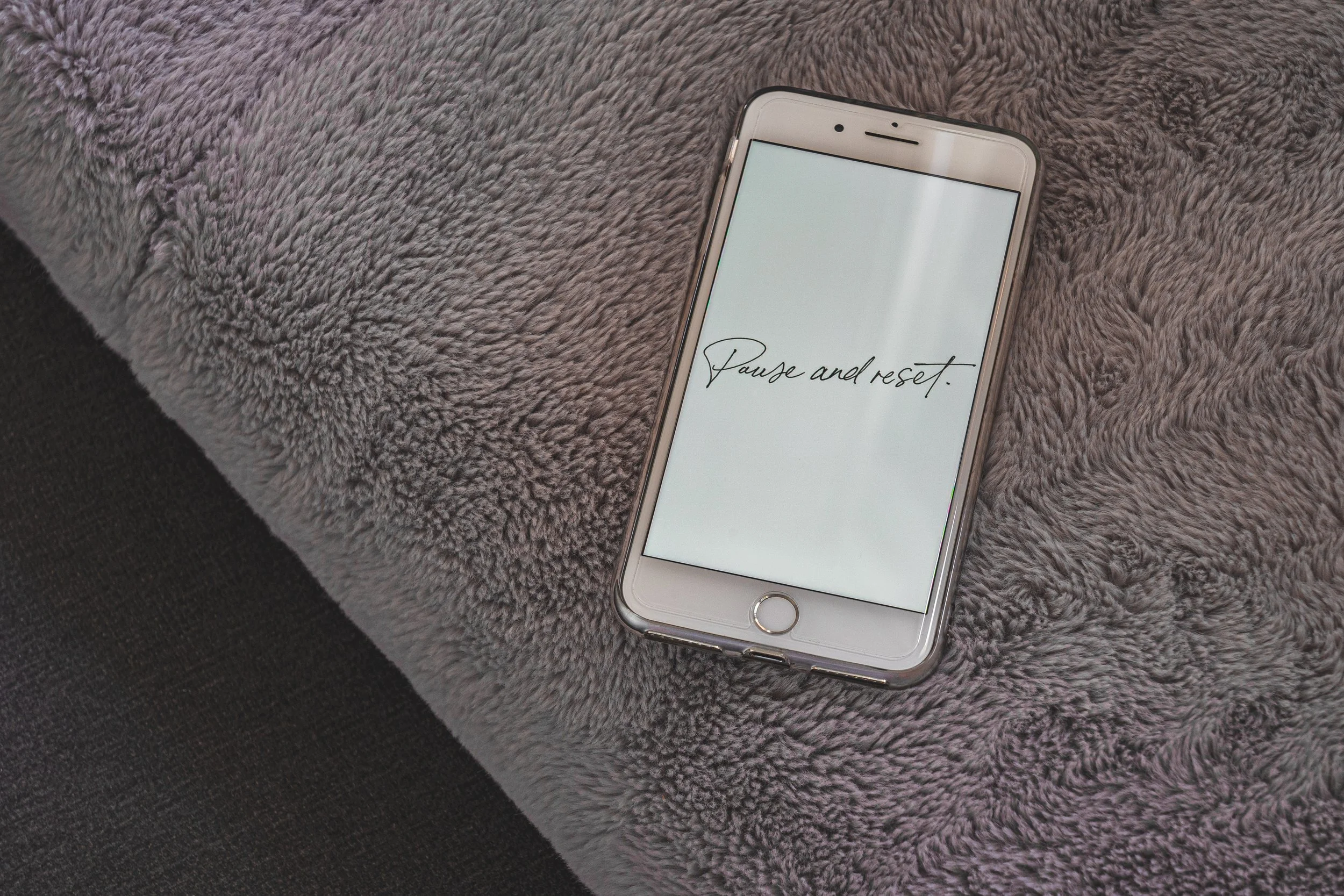 Smartphone sur un coussin gris affiche le message "Pause and reset"